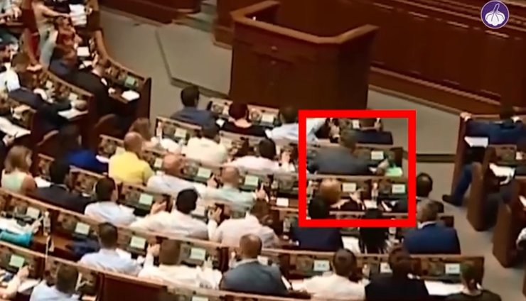 Лицо нардепа-нарушителя на видео не видно, но согласно схеме размещения фракций и групп в сессионном зале, его место закреплено за нардепом от "Слуги народа" Сергеем Литвиненко, а место депутата справа от него, который отсутствовал, – за Александром Скичко.
