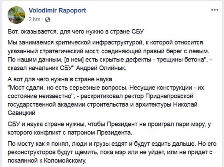 16 августа Борис Филатов написал пост, в котором пожаловался, что некий "князь Тьмы" и принадлежащий ему телеканал ищет героев, которые пострадали из-за моста, находящегося на реконструкции. Мэр намекнул, что ему тоже есть что сказать, однако расследование на "1+1" все-таки вышло — вскоре после досрочного открытия переправы и презентации сурового на вид "мэрского кресла". А перед этим — для разминки — пару новостных сюжетов об "очередных скандалах вокруг многострадального моста".