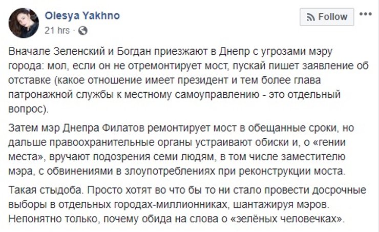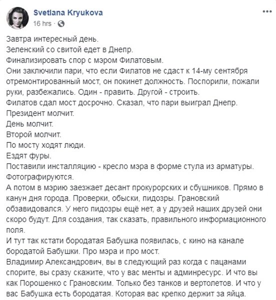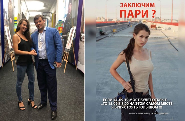 Периодически это ожидание разбавляла менее серьезная сюжетная линия с обещанием днепровской ню-модели раздеться на мосту, если его откроют в срок. Впрочем, несмотря на всю фривольность, в этой истории нашлось место и Филатову, который радостно перепостил анонс этого события, и его заместителю Михаилу Лысенко, который активно комментировал деятельность девушки, и Андрею Богдану, который пригласил модель на Банковую накануне поездки Зеленского в город. Видимо, в качестве одного из экспертов, которых так не хватало во время спонтанной пресс-конференции на мосту.
