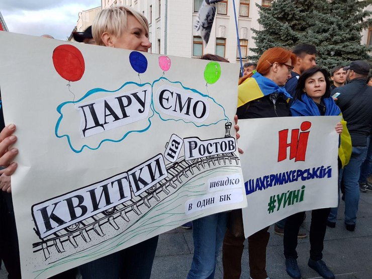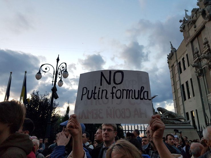 Митингующие требуют не подписывать капитуляционных соглашений с президентом Российской Федерации Владимиром Путиным, а также ни при каких обстоятельствах не имплементировать формулу Штайнмайера и не соглашаться на узаконивание пророссийской автономии Донбасса и амнистию для боевиков.