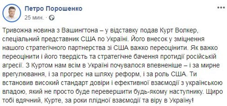 Бывший президент Украины Петр Порошенко заявил, что вклад Курта Волкера в укрепление нашего стратегического партнерства с США трудно переоценить. Как трудно переоценить и его твердость и стратегическое видение противодействия российской агрессии.