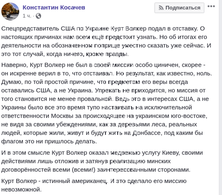 Константин Косачев, который является председателем международного комитета российского Совета Федераций заявил, что Курт Волкер своим решением об отставке отсрочил реализацию Минских договоренностей.