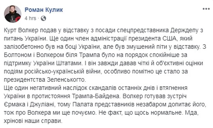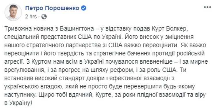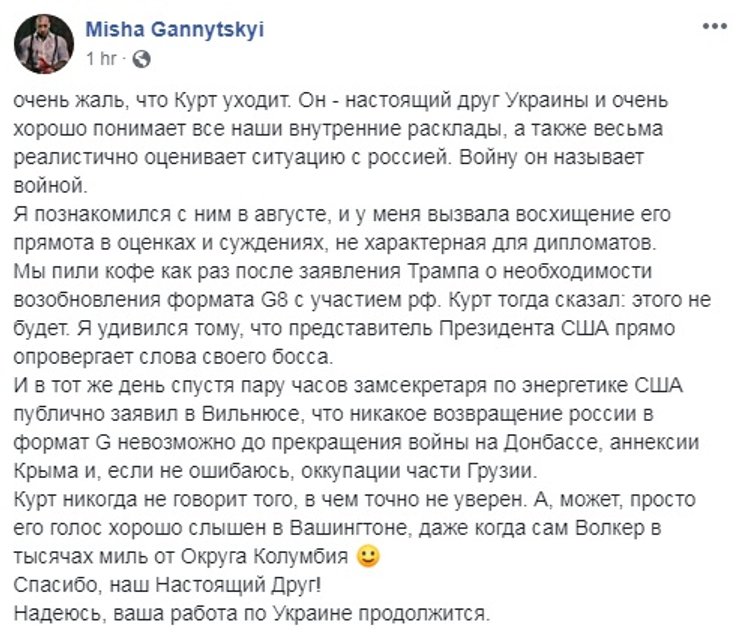 Но те украинские политики и журналисты, которые работали вместе с Волкером, о его уходе все же отозвались неодобрительно, посчитав, что теперь в США стало на "одного друга Украины меньше".
