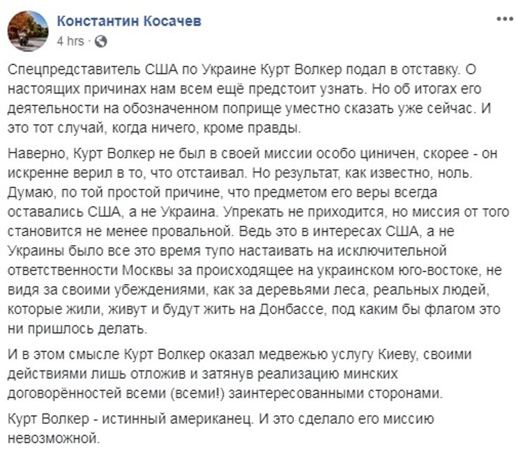 В самой РФ отставку Волкера пока обсуждают сдержанно. Считают, что он оказал "медвежью услугу" Украине и отсрочил реализацию Минских договоренностей. Так считает, в частности, глава международного комитета Совета Федерации в РФ Константин Косачев.