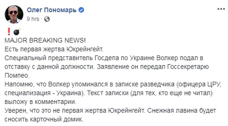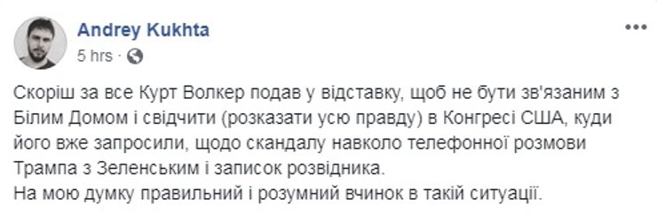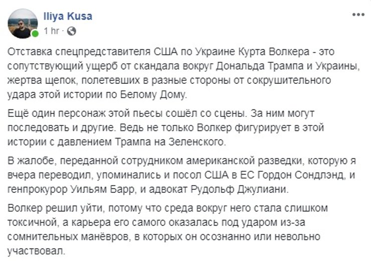 Впрочем, не все эксперты считают, что отставка спецпредставителя США стала неожиданностью или что она будет иметь серьезные последствия для украино-американских отношений. "Отставка Курта Волкера была предсказуемой. Правда, произошло это не из-за публикации стенограммы переговоров президентов Трампа и Зеленского. А после обнародования жалобы сотрудника американских спецслужб, которая была рассекречена Комитетом по вопросам разведки Палаты представителей США. Дело в том, что в ней упоминается визит Волкера в Киев, вскоре после звонка Трампа Зеленскому. Теперь, Волкер наверняка будет допрошен в Конгрессе США в качестве свидетеля", – рассказал в комментарии Фокусу эксперт-международник Максим Яли.