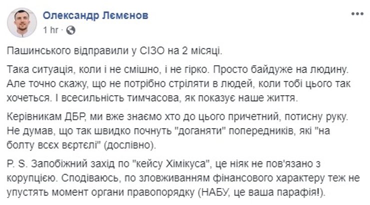 Пашинскому объявили обвинение по давнему делу, которое имело место быть в 2016 году 31 декабря. У села Хлепча возник инцидент между тогда еще нардепом и неким Вячеславом Химикусом. По словам нардепа, он получил от Химикуса бутылкой по голове и, защищаясь, выстрелил ему в ногу. Также был произведен предупредительный выстрел в воздух.