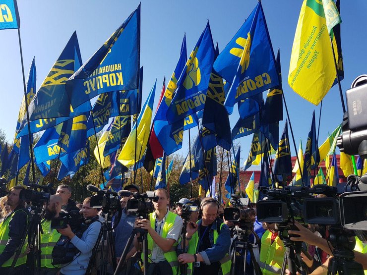 Марш разделился на две части, одна из которых двинулась к Офису президента. Среди них представители ВО "Свобода", "Правый сектор", а также вышедшие на протест фермеры.