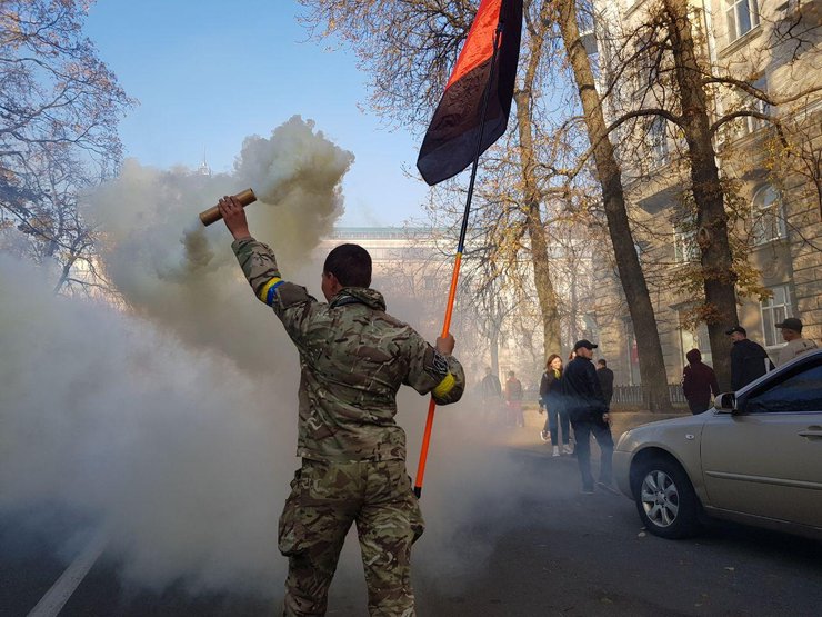 В завершение марша у Офиса президента, некоторые участники зажгли дымовые шашки. Также участинки передали свои требования в Офис президента и сейчас возвращаются на Майдан.
