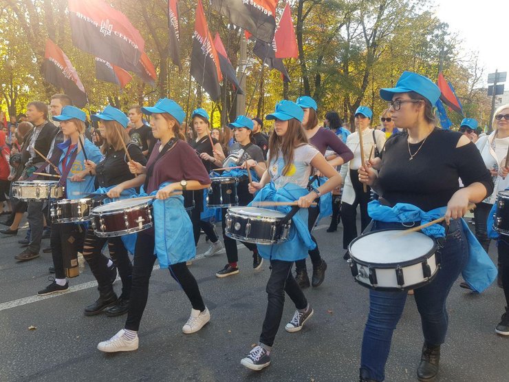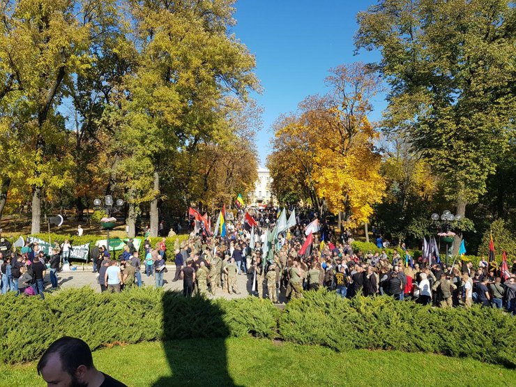 На данный момент участники мероприятия, около 2 тыс. человек, выстраиваются в колонну для марша. Присутствующие держат флаги "Правого сектора", ВО "Свобода", "Нацкорпус", "Сокол", УНА-УНСО.