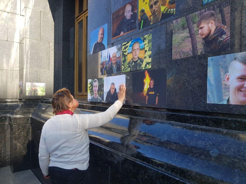 Пройдя через центр столицы, участники мероприятия двинулись к Офису президента, где наклеили на здание портреты погибших украинских бойцов.