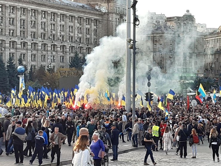 Участники марша движутся в сторону Европейской площади в центре Киева. В это же время, на Майдане установили сцену. Ожидается, что там продолжится акция протеста.