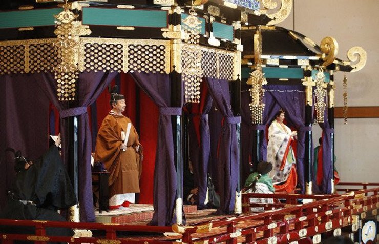 Нарухито посетил три императорских святилища. Он передал богине Солнца, душам своих предков и различным божествам послание о том, что сегодня состоится церемония интронизации.