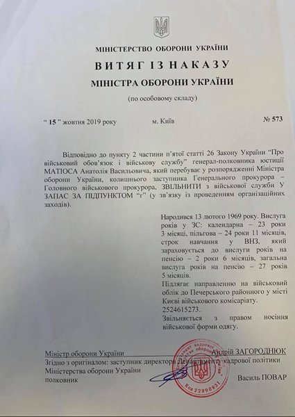 - В сентябре генеральный прокурор Руслан Рябошапка подписал приказ об увольнении с должности Главного военного прокурора Анатолия Матиоса.