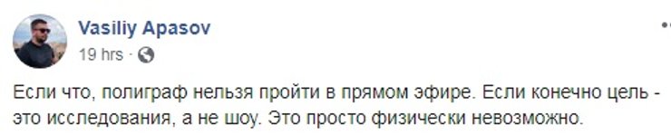 Пока Дубинский вел подготовку к прямому эфире его опередил другой однопартиец Александр Качура. Проверка ожидаемо показала, что надреп взяток не брал. Качура также объявил "полиграф-челлендж", призвав своих коллег в течение 5 дней пройти тест на полиграфе.