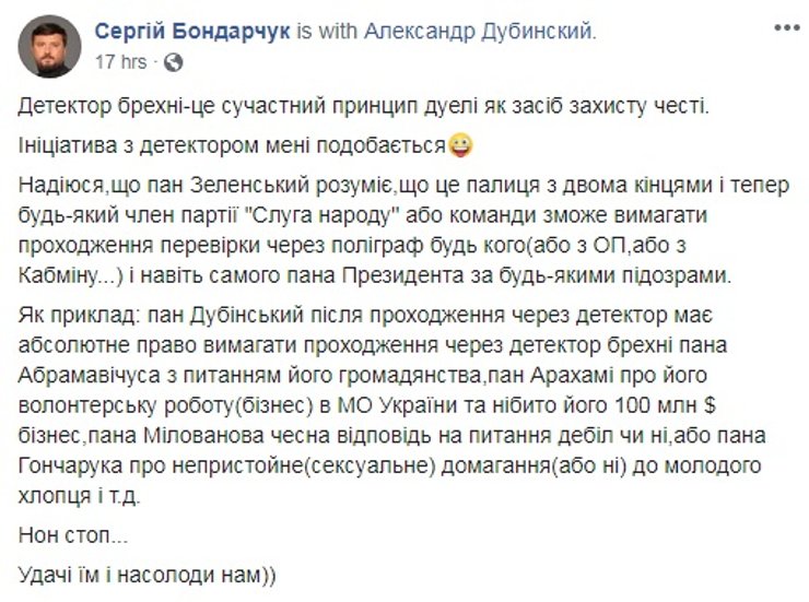 Однако пока переговоры с компетентными ведомствами еще ведутся, "слуги народа" решили не тянуть время и воспользоваться услугами частных полиграфологов. Первым о такой идее заявил Александр Дубинский (один из нардепов, проголосовавших против 18 октября) и даже провел на своих страницах в соцсетях пиар-кампанию своей инициативы. Вызов Дубинского принял также и глава фракции. При этом лично к Дубинскому никто претензий не предъявлял. Ранее Арахамия под одним из его постов написал, что нардеп уже давно публично высказывал свою позицию по законопроекту и поэтому в искренности его голосования никто не сомневается.
