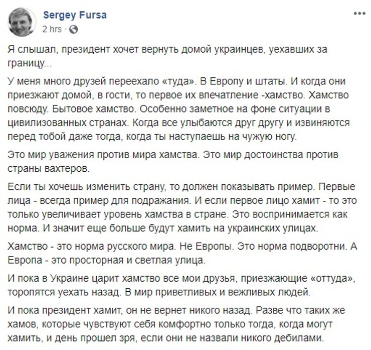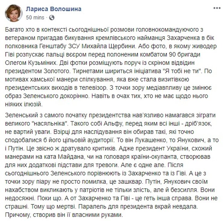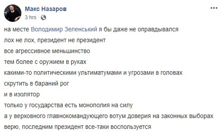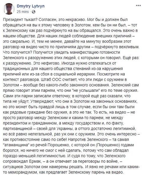 Первая реакция последовала от оппонентов президента и была возмущенной. Мол, Зеленский нахамил и это плохо выглядит. Он должен был быть сдержанней и обращаться к собеседнику уважительней, даже если он явился на передовую с оружием несанкционировано, занял чужой дом (пустующий), и не идет на переговоры.