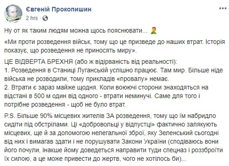 На данный момент совершенно непонятно, что будет дальше. Очевидно лишь то, что пока обстрелы со стороны боевиков продолжаются и никакого разведения произойти не может. При этом участники акции "Нет капитуляции" продолжают занимать пустующий дом в Золотом, бросая вызов государству, а у Зеленского не получилось найти взаимопонимания с националистами. Ситуация снова стала патовой.