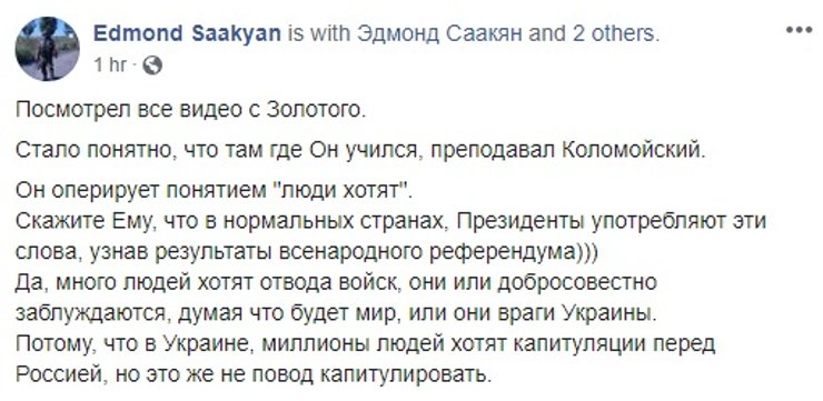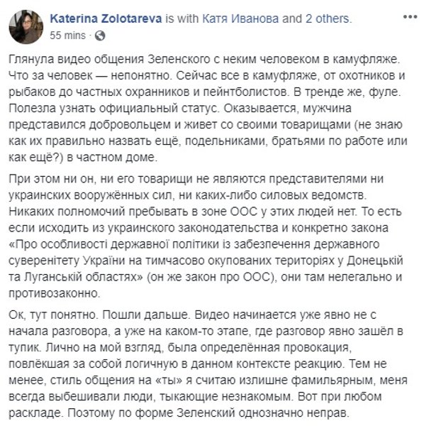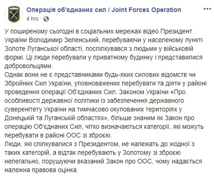 Поездка Владимира Зеленского в поселок Золотое, где президент Украины пообщался с вооруженными участниками акции "Нет капитуляции", незаконно пребывающими в зоне проведения ООС, не осталась без внимания пользователей Facebook. В фокусе ожидаемо оказалась неподражаемая риторика главы государства.