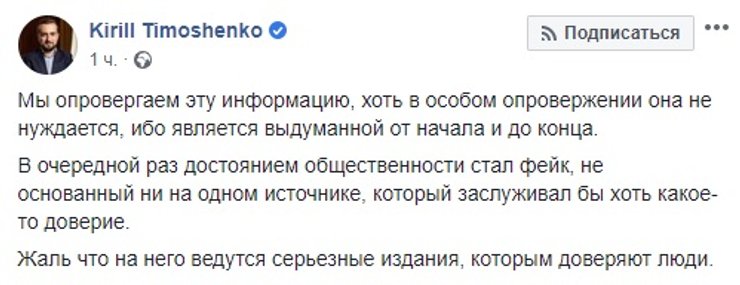 "Мы опровергаем эту информацию, хоть в особом опровержении она не нуждается, ибо является выдуманной от начала и до конца. В очередной раз достоянием общественности стал фейк, не основанный ни на одном источнике, который заслуживал бы хоть какое-то доверие. Жаль что на него ведутся серьезные издания, которым доверяют люди", – написал Тимошенко в Facebook.