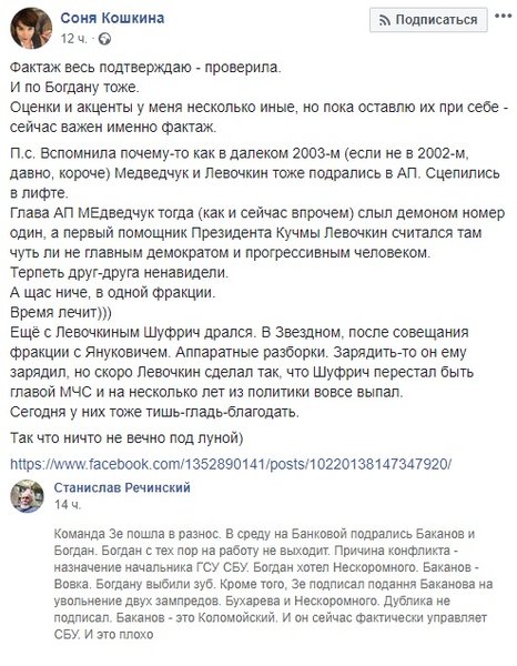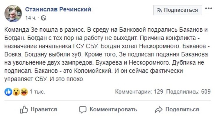 "Команда Зе пошла в разнос. В среду на Банковой подрались Баканов и Богдан. Богдан с тех пор на работу не выходит. Причина конфликта – назначение начальника ГСУ СБУ. Богдан хотел Нескоромного. Баканов – Вовка. Богдану выбили зуб. Кроме того, Зе подписал подання Баканова на увольнение двух зампредов. Бухарева и Нескоромного. Дублика не подписал. Баканов – это Коломойский. И он сейчас фактически управляет СБУ. И это плохо", – написал Речинский.
