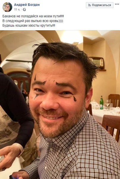 "Баканов не попадайся на моем пути!!!! В следующий раз выпью всю кровь)))) Будешь кошкам хвосты крутить!!!", – написал глава Офиса президента.