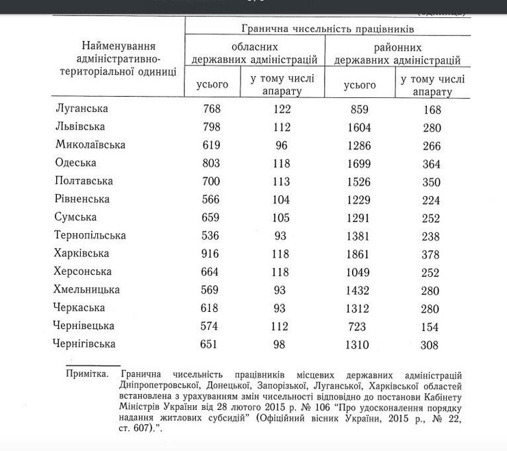 Согласно предельной численности чиновников от 2014 года, больше всего сотрудников райгосадминистраций сократили в Киевской (с 2863 работников до 1910), Винницкой (с 3115 до 2102) и Житомирской (с 2374 до 1516) областях.