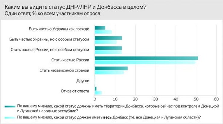 При этом 50,9 % считают, что нынешние территории "ЛНР/ДНР" должны стать частью России, еще 13,4% — "частью России, но с особым статусом".