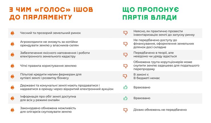 В партии утверждают, что принятый в первом чтении законопроект этим задачам не отвечает. "Голос" также озвучил свои предложения к земельной реформе.