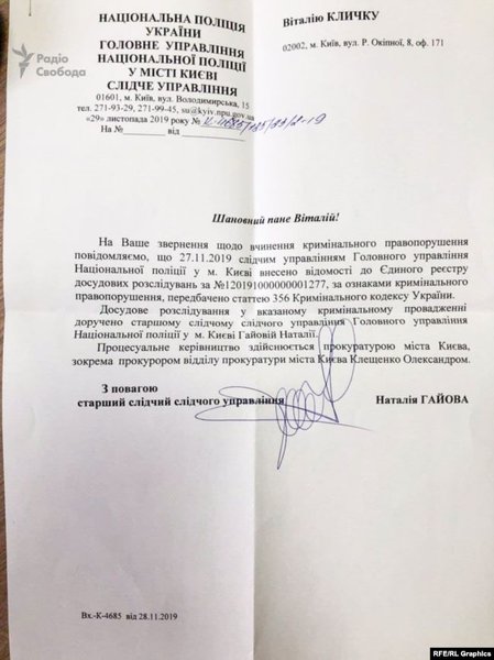 Об этом говорится в оказавшемся в распоряжении Радио Свобода ответе правоохранителей мэру украинской столицы.