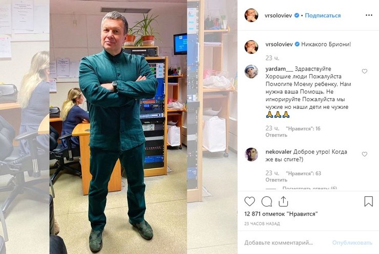 Соловьев также отреагировал и на "туфли Бриони", выложив в Instagram фото с подписью "никакого Бриони".