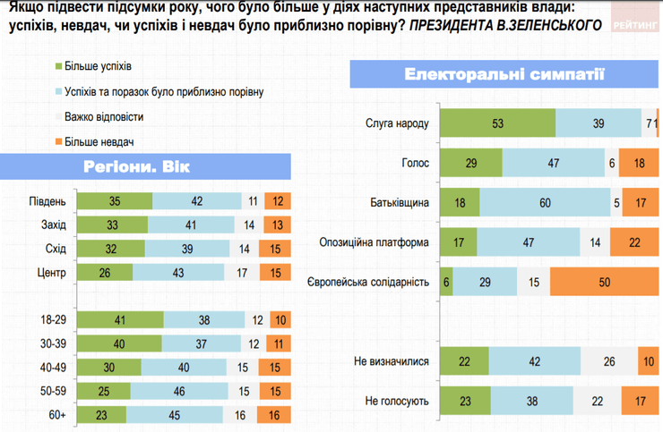 Треть опрошенных украинцев считают, что по итогам года в действиях Зеленского было больше успехов, чем неудач. 41% сказали, что в действиях президента успехов и поражений было поровну. Лишь 14% отметили, что в его работе преобладали неудачи. Последний тезис больше всего поддерживают избиратели "Европейской солидарности".