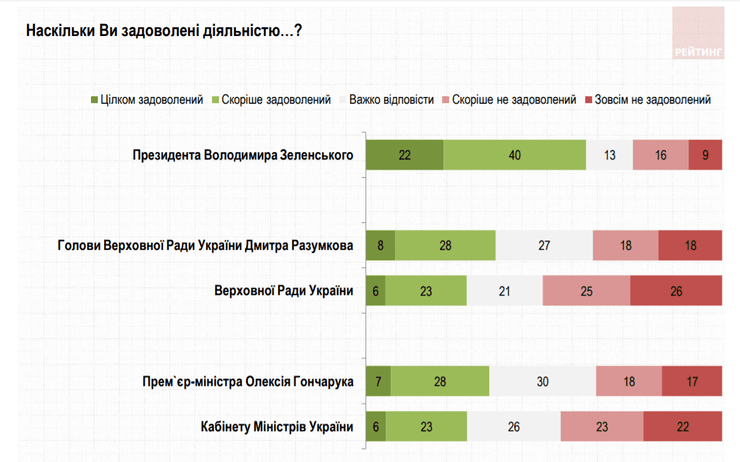 Подобная тенденция и в оценках работы правительства: деятельностью премьер-министра Алексея Гончарука довольны относительно больше, чем работой всего Кабмина. 35% выразили удовлетворенность деятельностью главы правительства (35% – недовольны, 30% – не смогли оценить). 29% довольны работой Кабмина, 45% – не удовлетворены, четверть не ответили на этот вопрос.