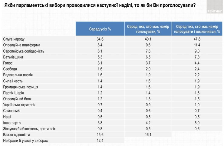 В конце ноября, согласно опросу "Рейтинга", "СН" поддерживали 44,8%, ОПЗЖ – 12,7%, "Евросолидарность" – 9,6%, "Батькивщину" – 8,5% и "Голос" – 4,4%.
