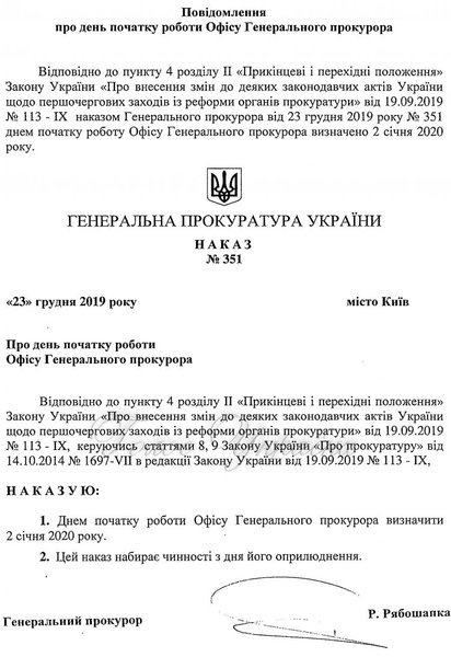 Об этом говорится в приказе Генпрокурора Руслана Рябошапки, который опубликован в "Голосе Украины".