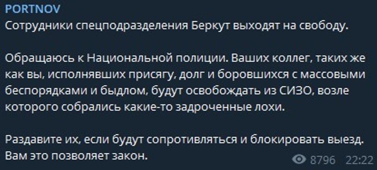 "Обращаюсь к Национальной полиции. Ваших коллег, таких же как вы, исполнявших присягу, долг и боровшихся с массовыми беспорядками и быдлом, будут освобождать из СИЗО, возле которого собрались какие-то задроченные лохи...