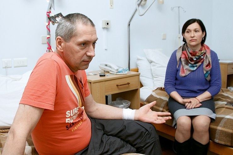 Двери палаты открывает его жена Светлана. Она выехала из Донецка спустя несколько месяцев после ареста мужа в декабре 2017 года, с тех пор живет в Киеве. Для нее въезд на неподконтрольную Украине территорию закрыт — боевики угрожали бросить в подвал. И Александра, и Светлану те подозревали в сотрудничестве со Службой безопасности Украины.