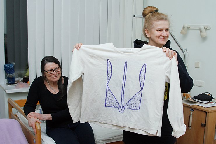 В холле второго корпуса встречаю Елену Сорокину. Ее лицо знакомо всей стране — во время обмена Лена вышла из автобуса в белом реглане с гербом и надписью "Моя держава — Україна". Рядом с Сорокиной — 72-летняя пенсионерка Анастасия Мухина. Обеих женщин террористы задержали в 2018-м, обвинили в государственной измене за то, что развешивали листовки в Первомайске и Луганске.