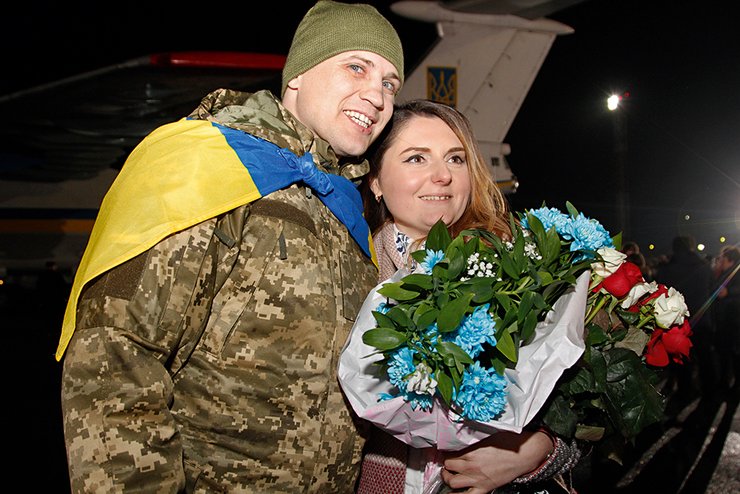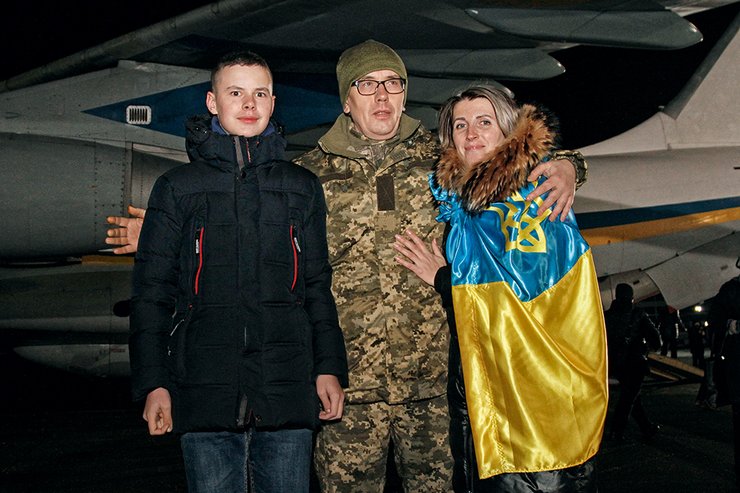 Аэропорт Борисполь. 29 декабря 2019 года. Примерно в 21:30 в темном небе над Киевом появляются огни военного спецборта. В самолете — 76 освобожденных из плена: 12 военных и 64 гражданских. На взлетной полосе — родственники, друзья и коллеги. Накануне организаторы встречи просили их не бежать хаотично к самолету, но как только на землю ступил его первый пассажир, матери, отцы, жены и дети, забыв о договоренностях, понеслись вперед. Следом за ними летели лишь лепестки желто-синих хризантем.