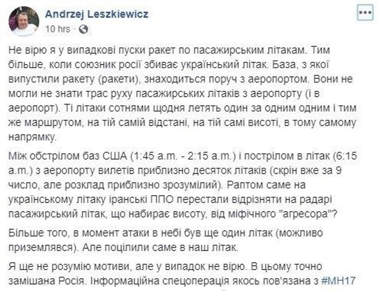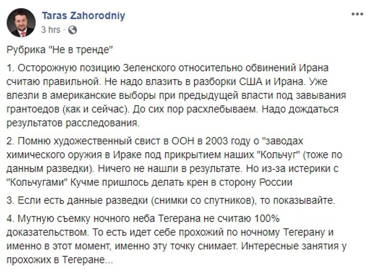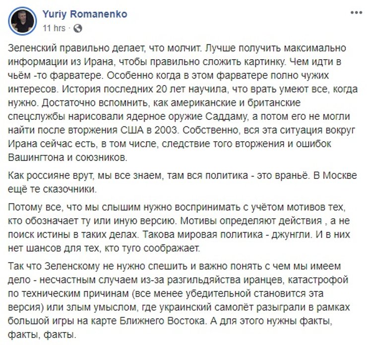 Впрочем, многим задержка и озвученная в итоге позиция показались логичными и правильными в данной ситуации. Мол, Украине не стоит ввязываться в геополитическое противостояние США и Ирана и необходимо ждать окончательных выводов расследования, в которых не будет сомнений. Тем более, что в отличие от западных спецслужб украинские никак не могли отследить запуски ракет в районе Тегерана.