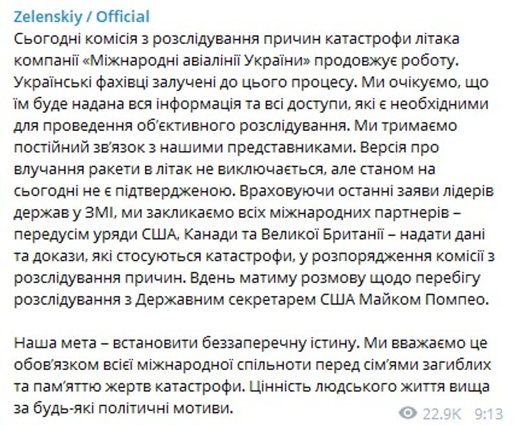 После резонансных заявлений западных лидеров президент Украины Владимир Зеленский более 12 часов хранил молчание, а когда все-таки его прервал, сообщил, что версия о попадании ракеты в самолет не исключается. Также он призвал международных партнеров предоставить данные, касающиеся катастрофы, в распоряжение комиссии по расследованию. И добавил, что "ценность человеческой жизни выше любых политических мотивов".