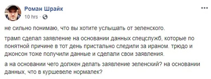 С такой позицией главы государства многие не согласились. Сразу после первых заявлений Трампа и Трюдо на Зеленского обрушились с критикой, что он не выступил солидарно с главными международными партнерами Украины. Припомнили и то, что пока западные спецслужбы выясняют причины трагедии, глава СБУ еще не вернулся с отдыха в Куршевеле.