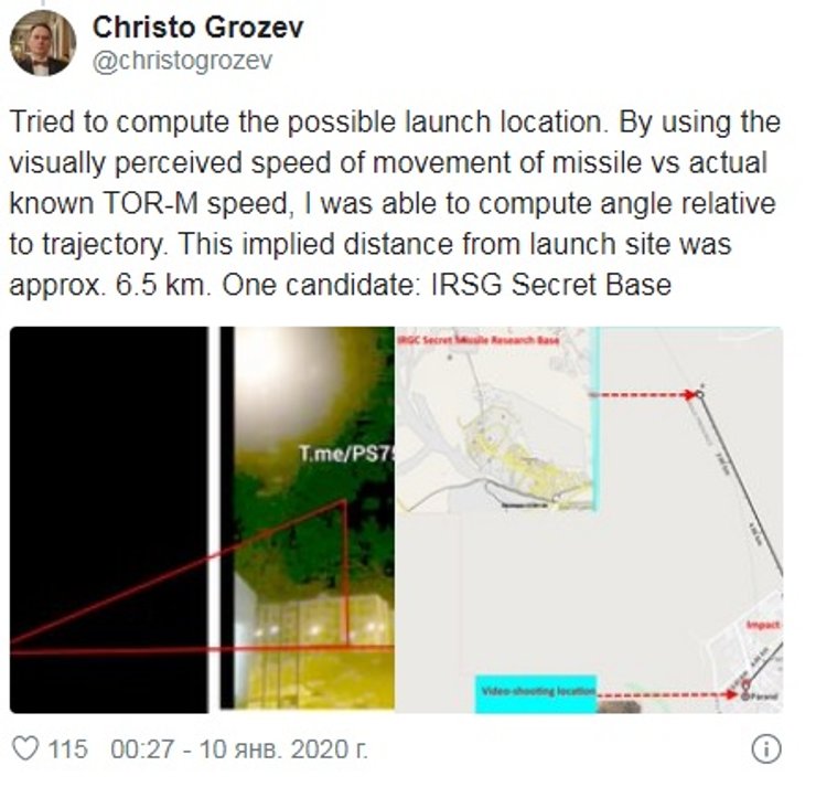 "Используя визуальновоспринимаемую скорость движения ракеты против фактически известной скорости ТОР-М, я смог вычислить угол относительно траектории. Это расстояние от места запуска составляло около 6,5 км. Один кандидат - секретная база IRSG", - написал исследователь.