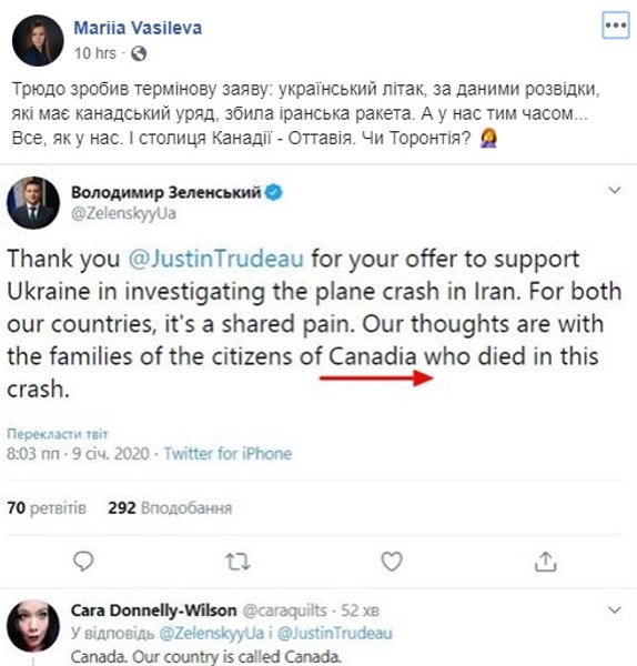 Раскритиковали президента и за очередные проблемы с коммуникацией. Ведь на фоне обвинений Ирана в причастности к катастофе, Украина как одна из главных пострадавших сторон хранит молчание. Обратили внимание пользователи и на твитт Зеленского с ошибкой в названии Канады.