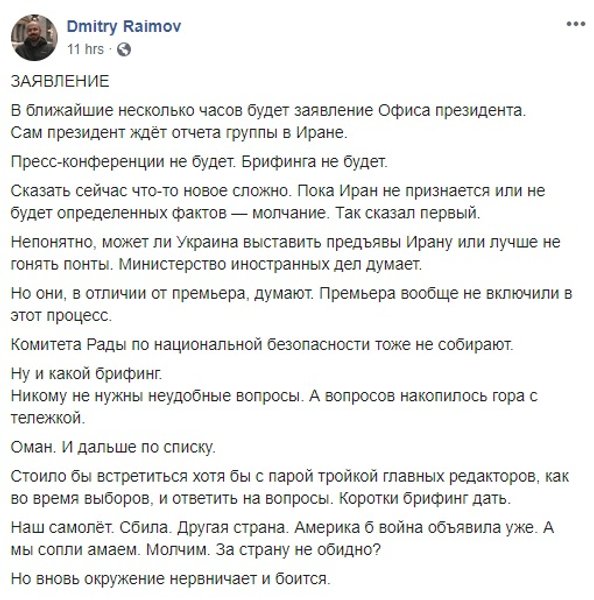 Тем временем, президент и глава МИД Вадим Пристайко встретились с временным поверенным США в Украине Кристиной Квин и получили от нее "важные данные" о катастрофе. На 15:00 у них назначен разговор с госсекретарем Майком Помпео. Возможно, после него позиция украинской стороны изменится.