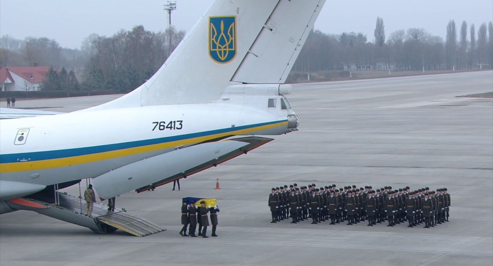 На церемонии прощания присутствуют первые лица Украины: президент Зеленский, премьер Гончарук и глава ВР Разумков