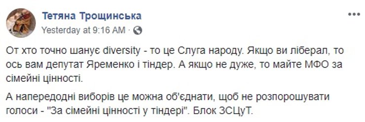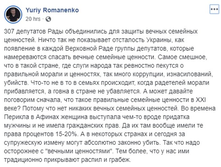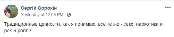 Также в соцсетях задались вопросом, почему нардепы решили, что украинцы сами не разберутся со своими семьями и ценностями. И предположили, что это попытка наладить отношения с электоратом преклонных лет, которому словосочетание "семейные ценности" и иллюзорная опасность, которая им грозит — это вполне себе причина, чтобы сменить свои политические предпочтения и поддержать тех, кто их защищает.