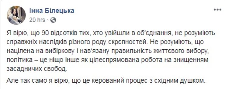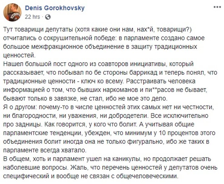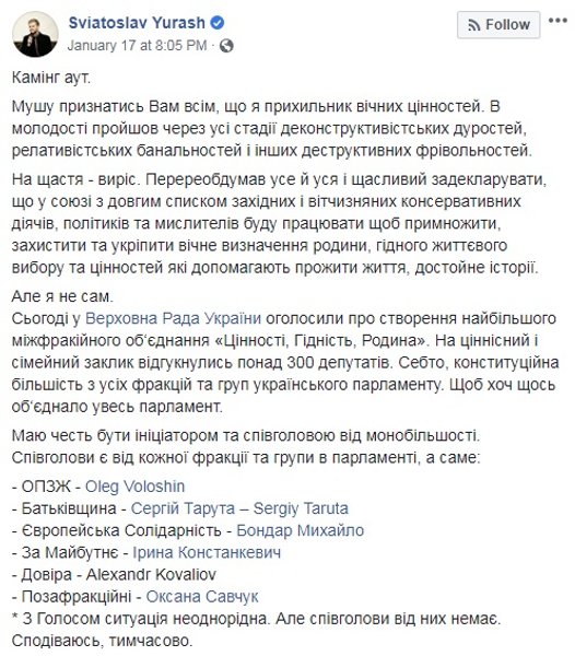Также обещают законы, которые будут "способствовать укреплению семейных ценностей" и "популяризацию и донесение широкого спектра мировой консервативной мысли в украинское интеллектуальное сообщество". Некоторые из членов новообразования даже совершили каминг-аут, рассказав, как раньше ошибались.