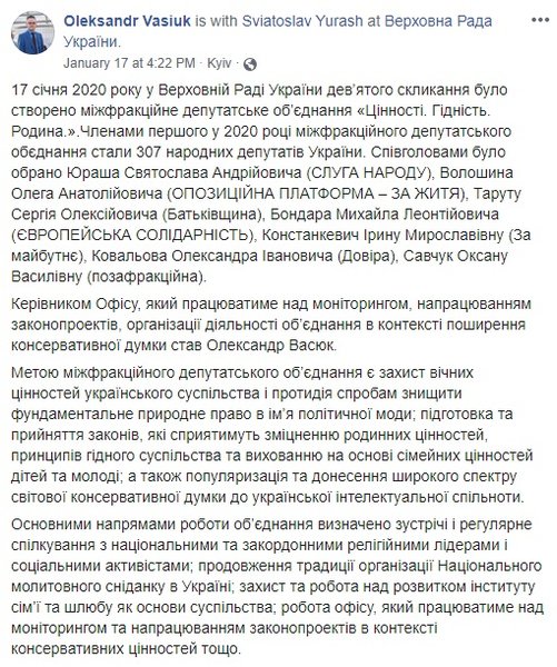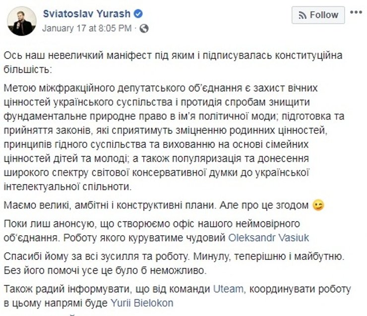 Сообщил об этом "радостном" событии "слуга народа" Александр Васюк на своей страничке в сети Facebook. Также он огласил список сопредседателей.
