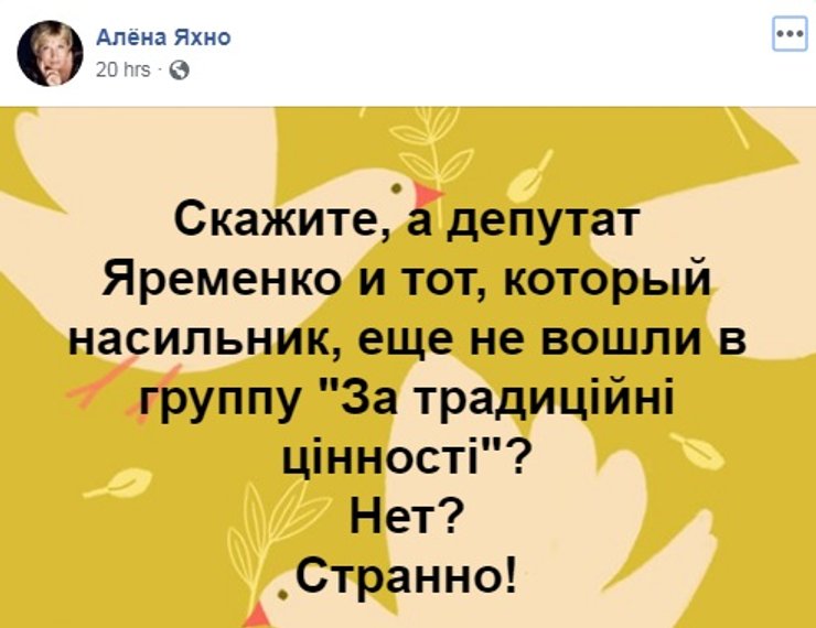 Те, кто изучил пост инициатора и идейного лидера Александра Васюка, поинтересовались, кого же туда взяли: неужели Богдана Яременко, который договаривался с проститутками об интимных услугах прямо в сессионном зале, а потом морочил голову журналистам, рассказывая, что это была провокация, или же Романа Иванисова, которого "выгнали" "слуги народа", когда выяснилось, что тот был осужден за изнасилование.