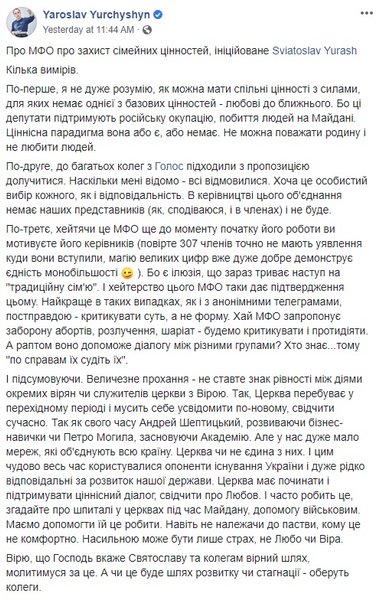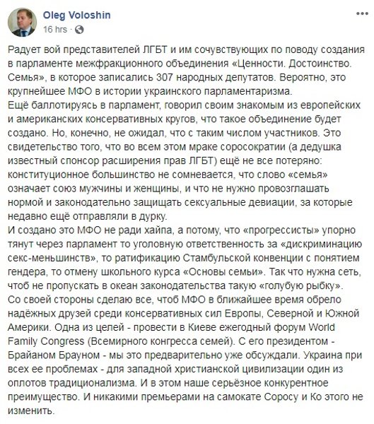 И намекнул, чем будет заниматься объединение: "защищать вечные ценности украинского общества и противодействовать попыткам уничтожить фундаментальное естественное право во имя политической моды".